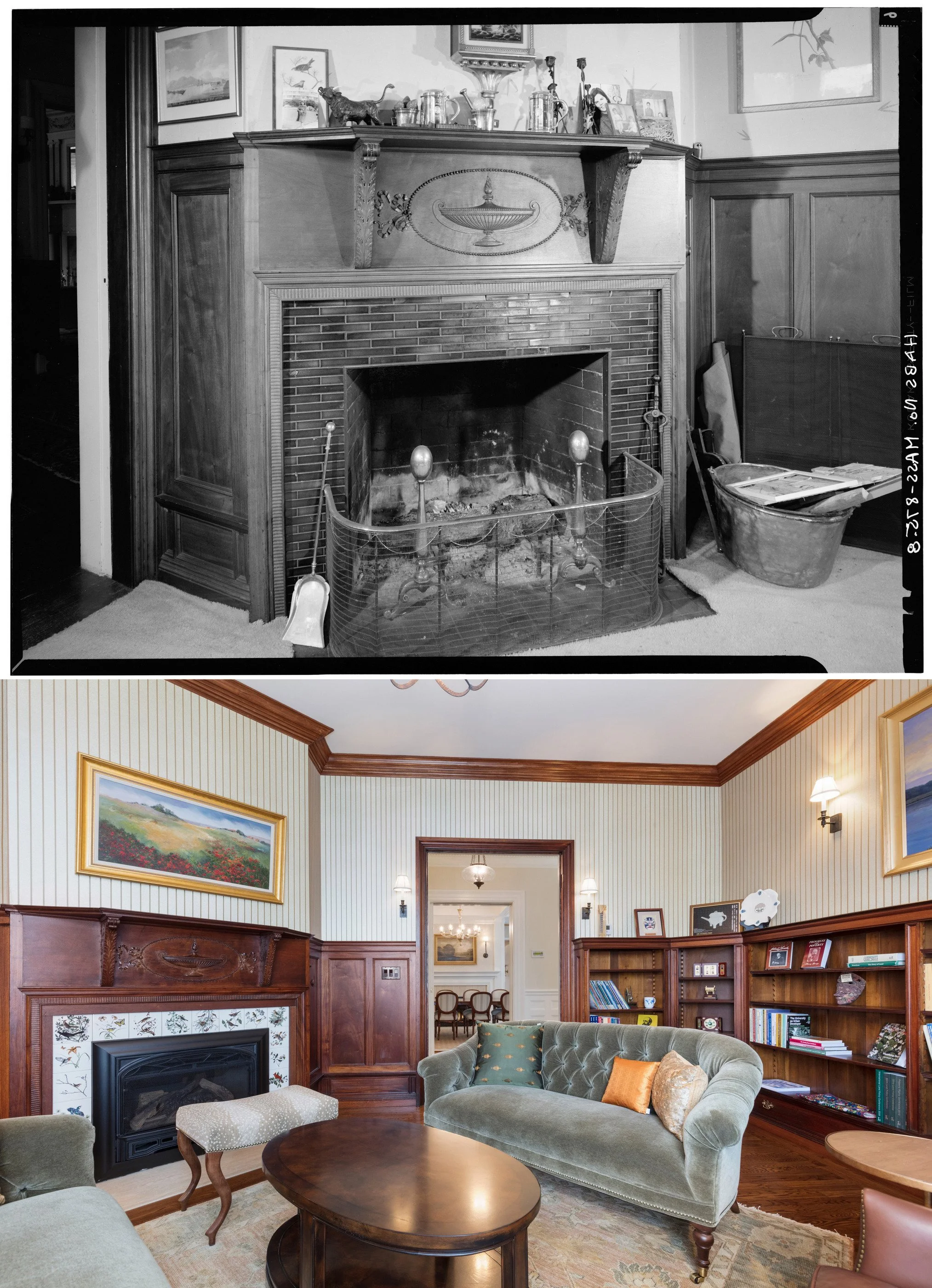 A cozy place to sit by the fireside. All the intricate woodworking details around the fireplace, including the mantel, wainscoting, crown molding, and ceiling medallion have been meticulously restored.